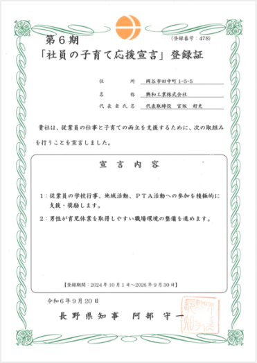 長野県の「社員の子育て応援宣言」に登録を行いました。本制度は、従業員が仕事と家庭の両立ができるような、「働きやすい職場環境づくり」の取組みを宣言する長野県の制度です。
